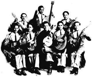 Another one of Dave's great attributes, which facilitated his rise to stardom in vaudeville was his ability to spot talent. In 1926 he met a group of Phillipine string players who had just lost their job in another show. He immediately hired them to be his "orchestra" and began working up the routines and musical numbers that would be part of his show (with various other singers, dancers, jugglers, and comedians) until the late 1930's. This group, which numbered from seven to ten players, used bandurias, mandolins, domras, guitars, bass and accordian. They all were talented musicians who knew hundreds of tunes, and together with Dave they evolved a rapport that was both musical and entertaining. "It cost me a lot to bring these boys from Russia. I hope you like them 'cause it's going to cost me more to send them back!"