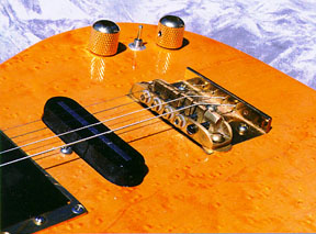 I removed one of the bridge pieces to make it a 5-string and sawed a piece off the end to make it smaller. Careful sanding, polishing, and filling the extra holes with brass dowels cut from screws & sanded flush, made a serviceable bridge. Other possibilities are body-mounted posts spanned by a compensated brass bar, or a carved wood bridge. Having a machine shop make one is a very expensive proposition. There are people around with machine shops in their garages, but it seemed like too much of a project to get involved in. Designing a good tailpiece was a tough nut to crack, but solved in a curious way. In a kitchen and bath fixtures store, looking for drawer pulls, I noticed a plain cabinet handle made of heavy brass with a flanged design. Eureka! The owner gave me a used one. Cutting it required scoring the surface, hacksawing away metal, and carefully sanding up to the line. (Sandpaper face up on a table and moving the tailpiece across it did the trick.) This is definitely an inefficient way to go but can give a very precise cut. (Almost all cutting of wood and brass was done in a similar low-tech way.) I drilled holes in the bridge for the strings, and used a file to make room for the string loop and a wider drill to seat the ball ends. The tailpiece maintains the telecaster look-- a mandolin tailpiece on this instrument didn't look good.
